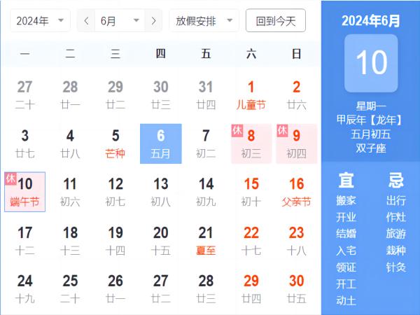 2024年6月8日(周六)至2024年6月10日(周一)放假3天